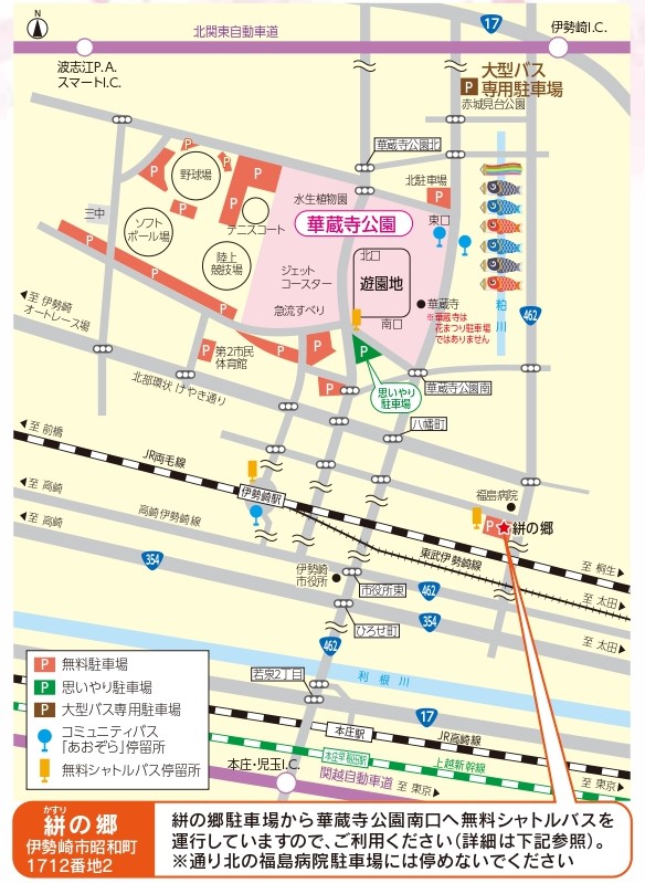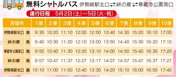 5月2日(土)から5月5日(火・祝)までは、伊勢崎駅北口⇔絣の郷駐車場⇔華蔵寺公園南口 間で無料シャトルバスを運行していますので、ご利用ください。