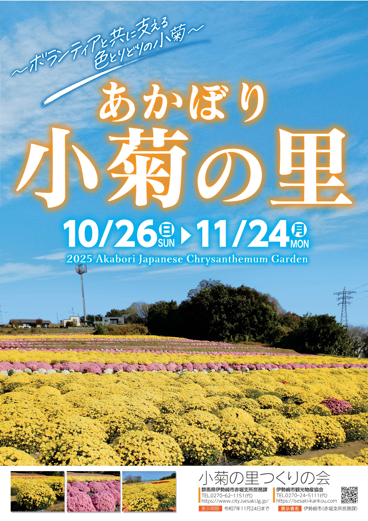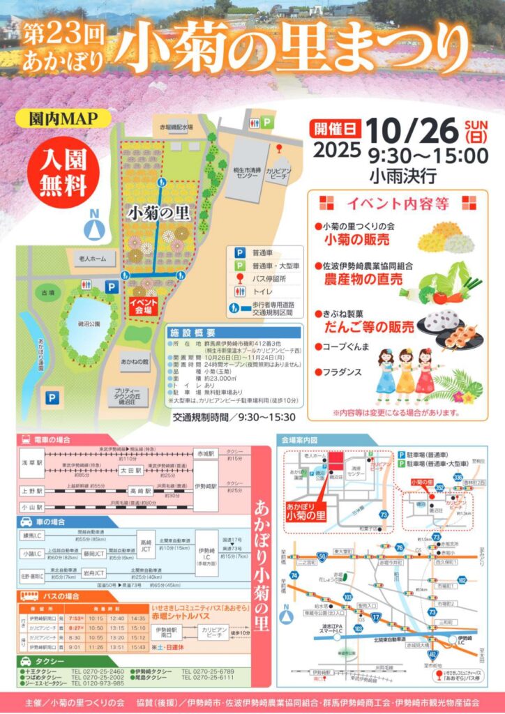 2025年10月17日 / 最終更新日 : 2025年10月17日 伊勢崎市観光物産協会 info 「あかぼり小菊の里」開園について あかぼり小菊の里が10月26日(日)から開園します。 チラシはコチラ 開園期間 令和7年10月26日(日)~11月24日(月・振) 開園時間 24時間(ライトアップなし) 所 在 地 伊勢崎市磯町412番3他(桐生市新里温水プールカリビアンビーチ西) 品 種 小菊(玉菊) 株 数 約20,000株 面 積 約23,000㎡ 入 園 料 無料 駐 車 場 無料駐車場あり ※大型車は、カリビアンビーチ駐車場利用(徒歩10分) ト イ レ あり(仮設簡易トイレ) 問合せ先 赤堀支所庶務課 ℡0270-62-1151(代) 伊勢崎市観光物産協会 ℡0270-24-5111(代) 地図・アクセス ※クリックすると拡大表示します。