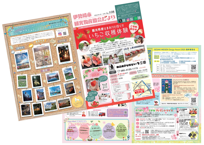 2026年3月2日 / 最終更新日 : 2026年2月27日 伊勢崎市観光物産協会 info 伊勢崎市観光物産協会だより 第108号 発行のお知らせ 伊勢崎市観光物産協会だよりの第108号を発行いたします。 主なトピック ●観光特使ひまわりと行く!!いちご収穫体験特集 ●華蔵寺公園花まつり ●ISESAKI MEISEN Design Award 2025 最終審査会 ●「いせさき銘仙の日」記念イベント ●もうすぐ春ですね プレゼントクイズ ●いせさきふぉと。2025 結果発表 第108号(令和8年3月1日) ※クリックするとpdfが開きます 過去の号はこちらからご覧いただけます。
